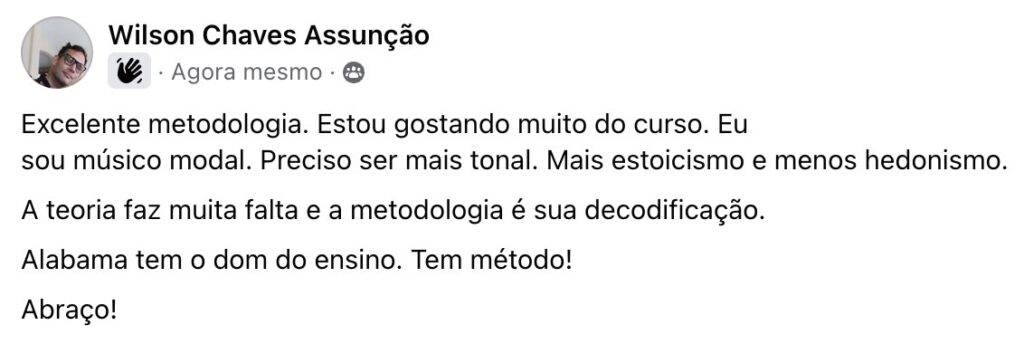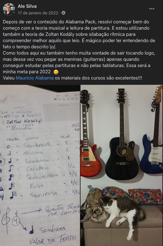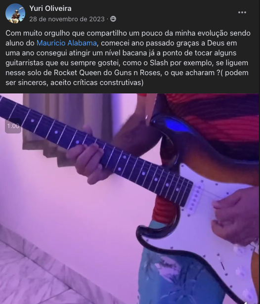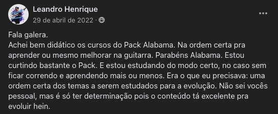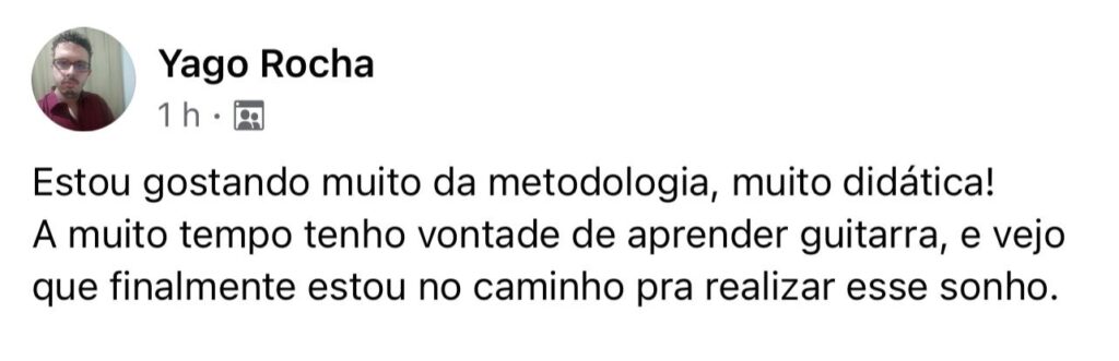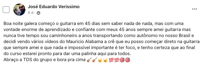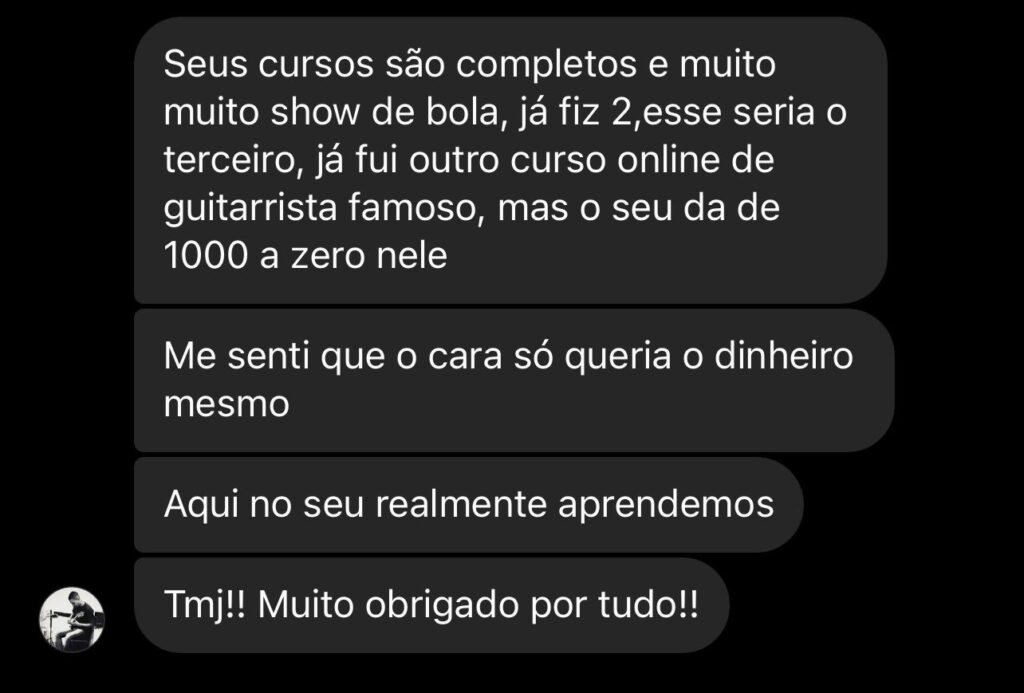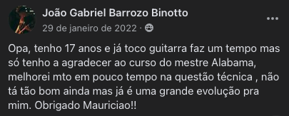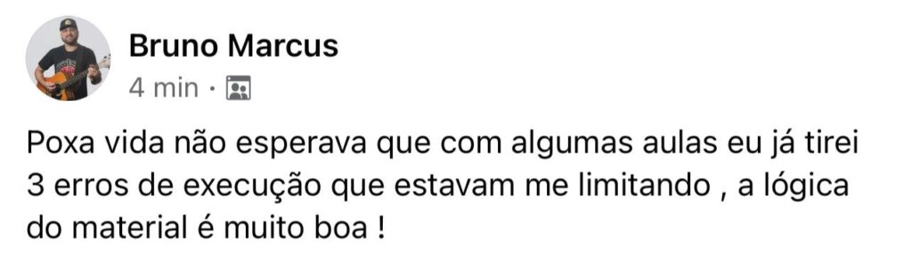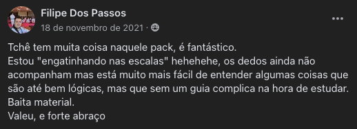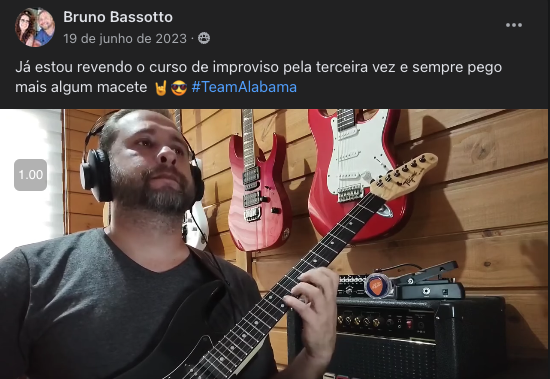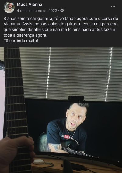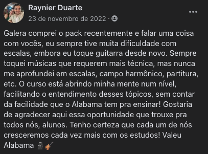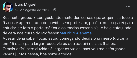 Você vai ter acesso a uma Comunidade Fechada no Facebook, exclusiva para alunos, onde você vai ter todo o meu suporte, seja para dúvidas do curso, seja para questões dos cursos ou outras questões do mundo da guitarra.